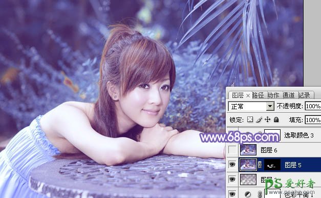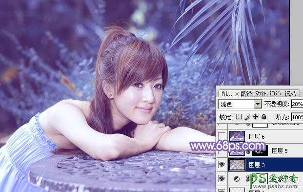 8、按Ctrl + Alt + 2 调出高光选区,按Ctrl + Shift + I 反选,新建一个图层填充暗蓝色:#6A4772,混合模式改为“滤色”,不透明度改为:20%,效果如下图。这一步适当增加图片暗部亮度。