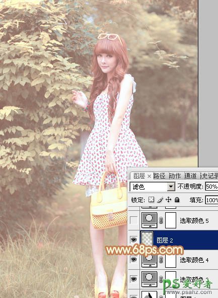 8、按Ctrl + Alt + 2 调出高光选区,按Ctrl + Shift + I 反选,新建一个图层填充褐色:#AFB596,混合模式改为“滤色”,不透明度改为:50%,效果如下图。这一步增加图片暗部亮度。