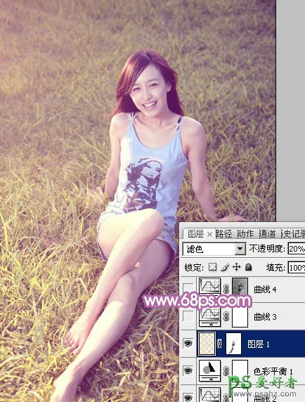 6、按Ctrl + Alt + 2 调出高光选区,新建一个图层填充淡黄色:#F0E4CA,混合模式改为“滤色”,不透明度改为:20%,添加图层蒙版,用黑色画笔把人物部分过曝的部分擦出来,效果如下图。这一步增强图片高光部分的颜色。