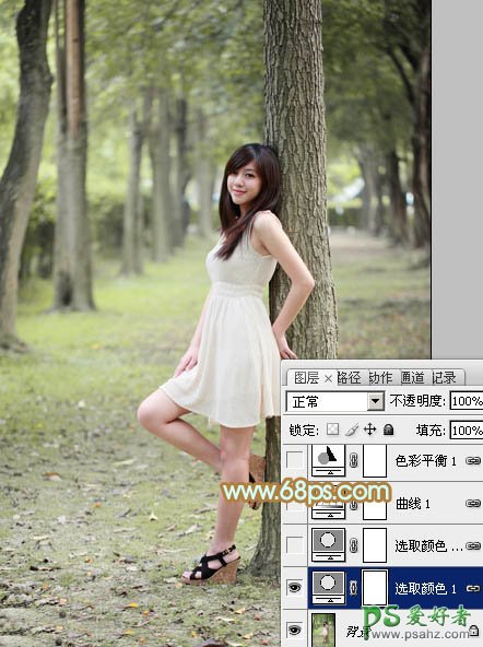 Ps图片处理教程:给树林中的美女照调出青色的图片效果
