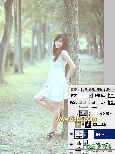 Ps图片处理教程:给树林中的美女照调出青色的图片效果