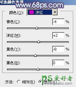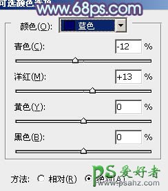 15、创建可选颜色调整图层,对蓝,洋红进行调整,参数设置如图34,35,效果如图36。这一步给图片增加蓝色。