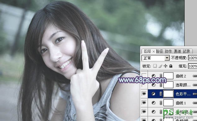 Ps图片处理教程:给树林中的美女照调出青色的图片效果