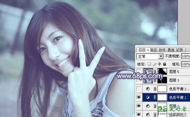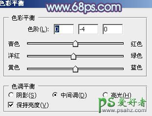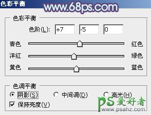 10、创建色彩平衡调整图层,对阴影、中间调、高光进行调整,参数设置如图26 - 28,效果如图29。这一步给图片增加蓝紫色。