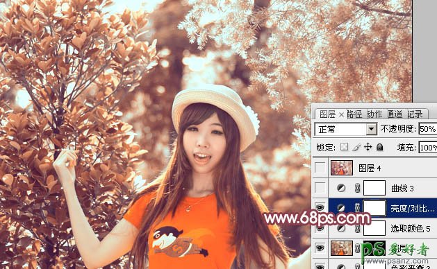 15、创建亮度/对比度调整图层,适当增加亮度及对比度,参数设置如图40,确定后把不透明度改为:50%,效果如图41。