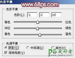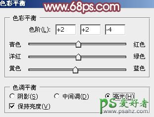 6、创建色彩平衡调整图层,对阴影,高光进行调整,参数设置如图16,17,效果如图18。这一步加强图片暗部及高光部分的颜色。