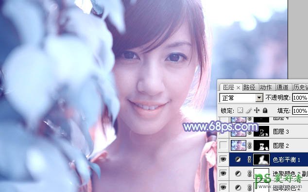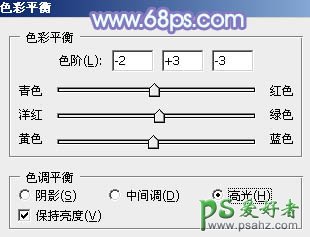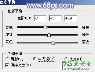 9、创建色彩平衡调整图层,对中间调,高光进行调整,参数设置如图17,18,确定后把蒙版填充黑色,用白色画笔把人物脸部及肤色部分擦出来,效果如图19。这一步微调人物肤色。