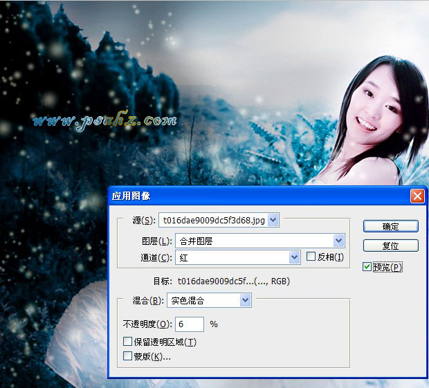 7、让画面对比的再强一些,再执行应用图像命令操作,设置参数见图: