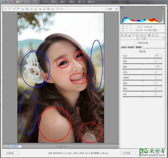 使用RAW转换格式的同时,对照片整体色彩进行调整。图中用蓝色标记的植物,发丝,头饰为补救并保留回来的内容;而红色标记的牙齿,眼白,高光为丢失的细节内容,Camera raw基于对前期不足以及照片整体进行调整,为了达到一定的效果在调整中丢失且不严重的细节部分可以通过后面的修调来还原;在进行整体色彩和细节的调整后使照片中的环境色彩变灰让照片看着柔和突出想要的主题,同时使片中人物的皮肤色彩变得通透来突出主体。