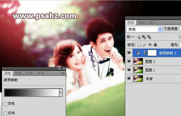 3、添加渐变映射调整图层,做黑白渐变,并将图层模式设为“变亮”不透明度“70%”,此按钮在图层面板最下方,