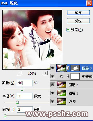4、盖印图层(shift+ctrl+alt+E),对图像做锐化调整,并添加图层蒙版对不需要锐化的地方,使用黑画笔擦除。有Topaz滤镜的朋友可用此滤镜,效果更好,在这里我就用程序自带的锐化滤镜。