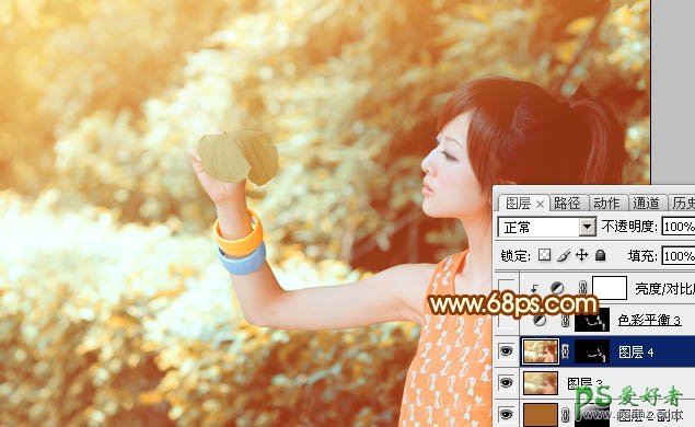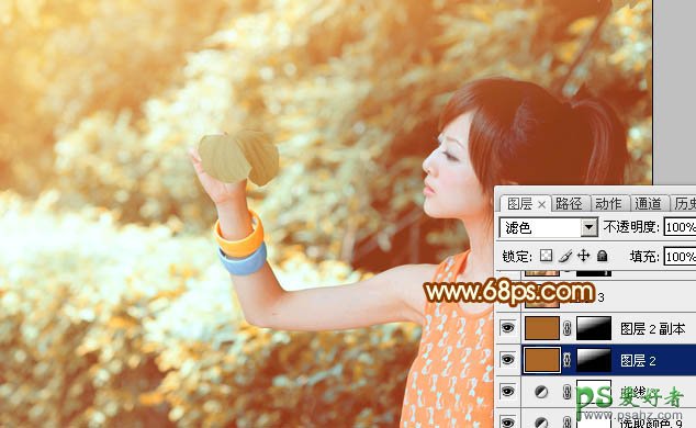 11、新建一个图层,填充黄褐色:#A86729,混合模式改为“滤色”,添加图层蒙版,用黑白渐变拉出下图所示的效果,如果高光还不够,可以把当前图层复制一层,适当降低图层不透明度。