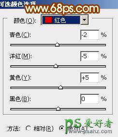 6、创建可选颜色调整图层,对红,黄进行调整,参数设置如图22,23,效果如图24。这一步给图片增加黄褐色。