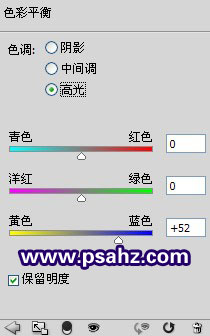 1、首先改变背景的基调,添加色彩平衡调整图层,观察背景于黄色居多,在不知道是什么颜色的情况下可以用色相饱和度的吸管来确定,这种我们将黄色做一下调整。设置如图: