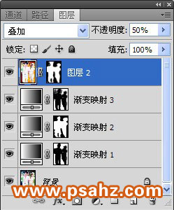 4、盖印图层(shift+ctrl+alt+e),将图层模式改为叠加。不透明度为50%,添加图层模版,用黑色画笔将人物擦出。