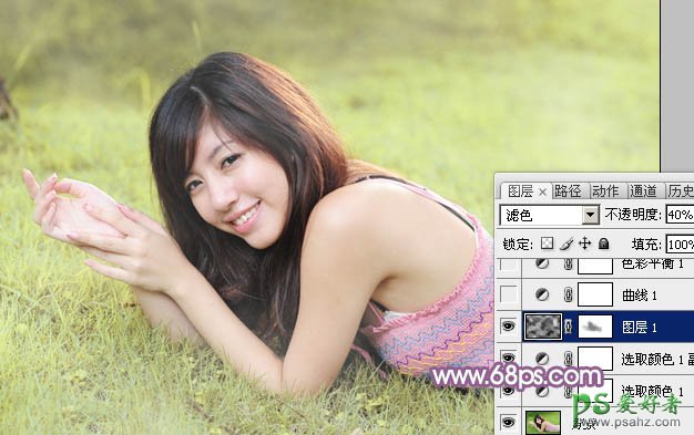 3、新建一个图层,按字母键“D”,把前,背景颜色恢复到默认的黑白。然后执行:滤镜 > 渲染 > 云彩,确定后把混合模式改为“滤色”,不透明度改为:40%。添加图层蒙版,用黑色画笔把人物脸部及肤色部分擦出来,如下图。这一步给背景增加梦幻效果。