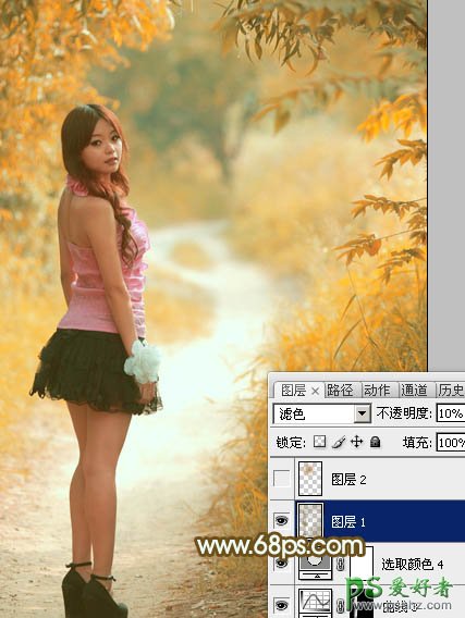 9、按Ctrl + Alt + 2 调出高光选区,按Ctrl + Shift + I 反选,新建一个图层填充黄褐色:#8D7D4A,混合模式改为“滤色”,不透明度改为:10%,效果如下图。