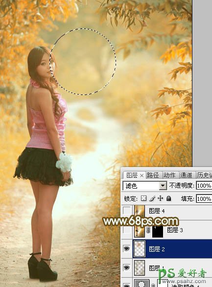 10、新建一个图层,用椭圆选框工具拉出下图所示的椭圆选区,羽化50个像素后填充黄褐色:#BC8841,混合模式改为“滤色”,效果如下图。这一步给图片局部增加高光。