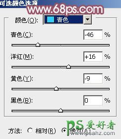 3、创建可选颜色调整图层,对青,中性色进行调整,参数设置如图11,12,效果如图13。这一步微调图片中间调颜色。