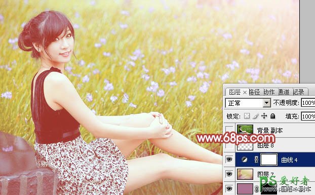photoshop给草地上自拍的美腿玉足少女调出小清新的粉黄色