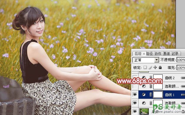 photoshop给草地上自拍的美腿玉足少女调出小清新的粉黄色