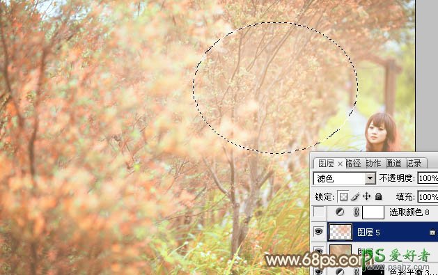 15、新建一个图层,用椭圆选框工具拉出下图所示的选区,羽化60个像素后填充橙红色:#ECA471,混合模式改为“滤色”,效果如下图。这一步给图片局部增加高光。