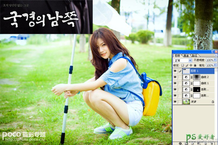 第八步:红色通道对白色进行调整,是天空偏蓝偏冷,头发偏暖,形成冷暖对比。(蒙版里面拉黑白渐变,使人物肤色不受曲线影响)