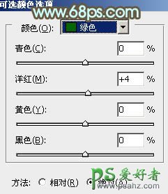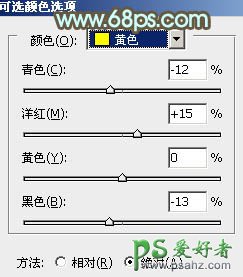 3、创建可选颜色调整图层,对黄,绿进行调整,参数及效果如下图。这一步把图片中的黄色转为橙黄色。