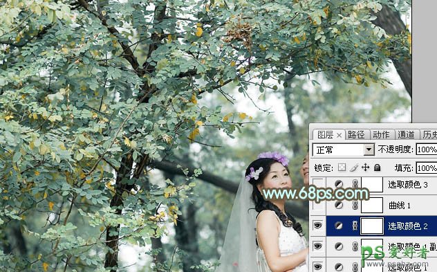 PS婚片调色教程:给外景树荫下的情侣婚纱照调出淡青色效果
