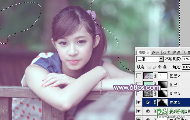 8、创建曲线调整图层,对RGB,绿通道进行调整,参数设置如图21,22,确定后把蒙版填充黑色,用白色画笔把图23选区部分擦出来。再把图层不透明度改为:60%。这一步给背景部分增加绿色。