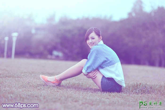 这里我们学习一下给草地上坐着的漂亮少女写真照调色,后期调色,美化图片,PS调色教程:打造柔美艺体青春少女艺术照-调出柔美的蓝色,处理的时候可以考虑把暗部颜色转为蓝色或蓝紫色,再把整体稍微调亮,高光部分增加一点淡蓝色即可。