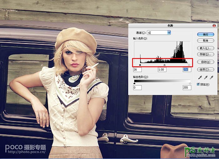 28、色阶通道-红,调整参数如图所示。