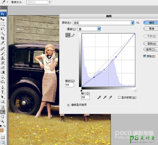 6、曲线通道-蓝,适当调整画面的色彩。