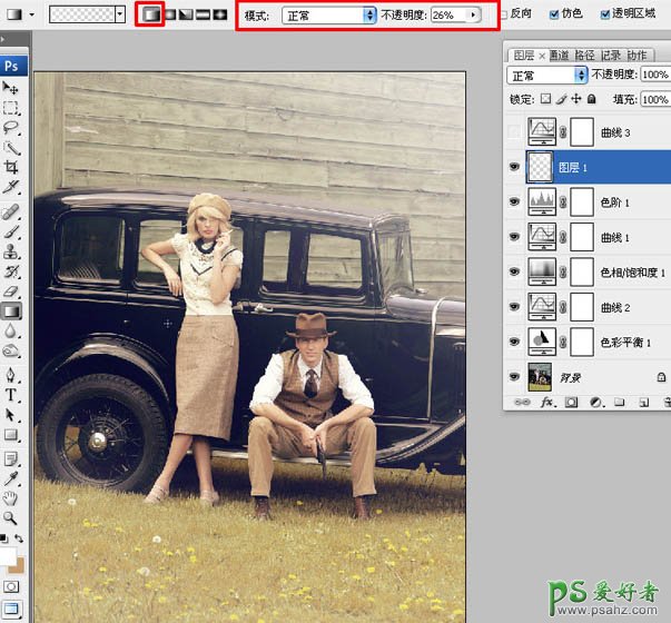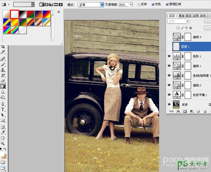 13、选择线性渐变,模式:正常。不透明度为26%。在图片的右上角适当拉出渐变色。效果如图所示。