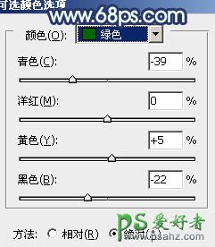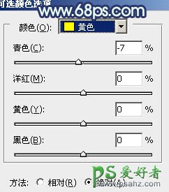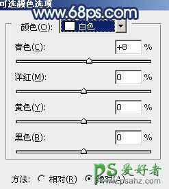 2、创建可选颜色调整图层,对黄、绿、白进行调整,参数设置如图5 - 7,效果如图8。这一步给图片增加橙黄色,同时加强高光部分的颜色。