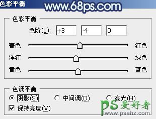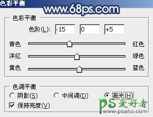 5、创建色彩平衡调整图层,对阴影,高光进行调整,参数设置如图18,19,效果如图20。这一步主要给图片高光部分增加淡蓝色。