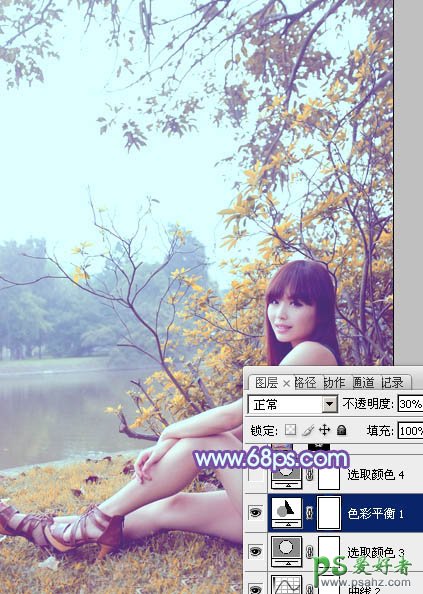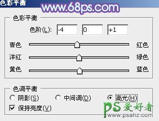 6、创建色彩平衡调整图层,对阴影,高光进行调整,参数设置如下图,确定后把图层不透明度改为:30%,效果如图25。这一步微调图片暗部及高光部分的颜色。
