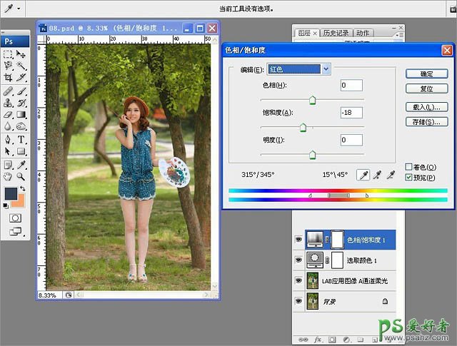 3、画面中的红色部分过于抢眼,继续添加“色相/饱和度”调整图层,选择“红色”,降低红色的饱和度-18,此时整体画面柔和了很多,人物肤色也回归正常。