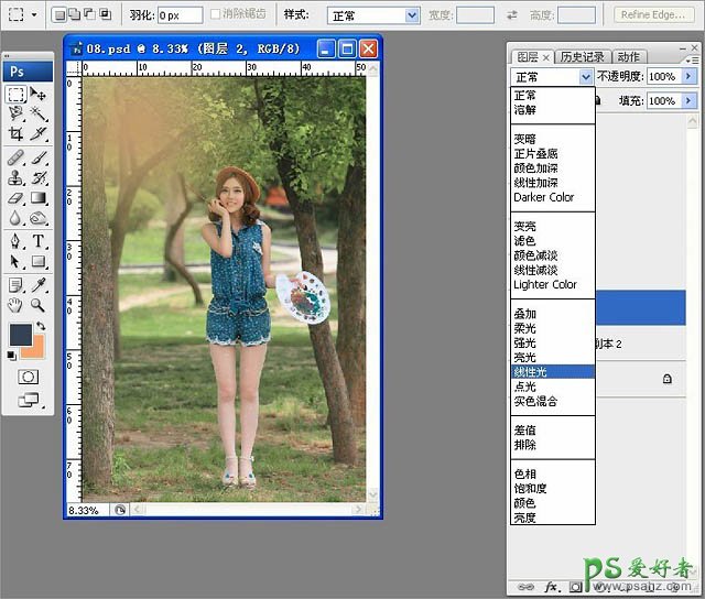 5、新建一个图层,用“渐变”工具给照片添加阳光的暖色高光,并将图层混合模式更改为“线性光”,这一操作不仅可以渲染环境氛围,同时也让照片拥有更强的空间感。