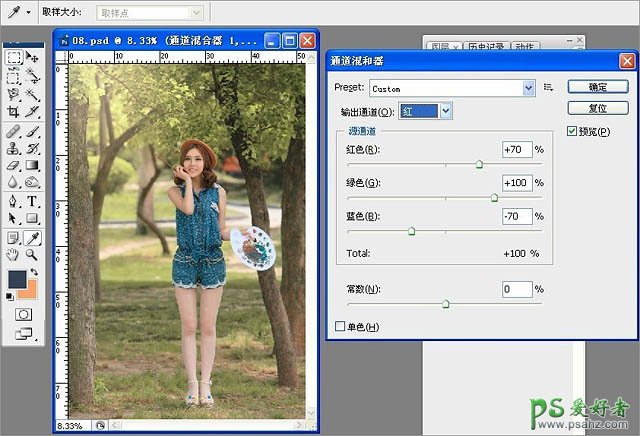 6、接下来营造画面的整体色彩基调。选择“通道混合器”,输出通道选择“红”,源通道参数设置为:红色+70、绿色+100、蓝色-70,这一调整使片子中的绿色更趋近与黄。
