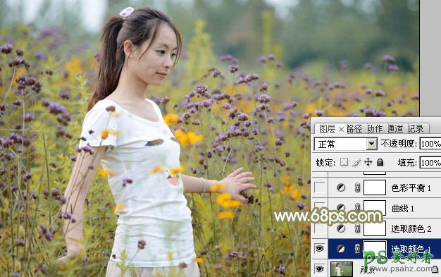 PS调色教程:给野花丛中的清新美女图片调出唯美的粉黄色
