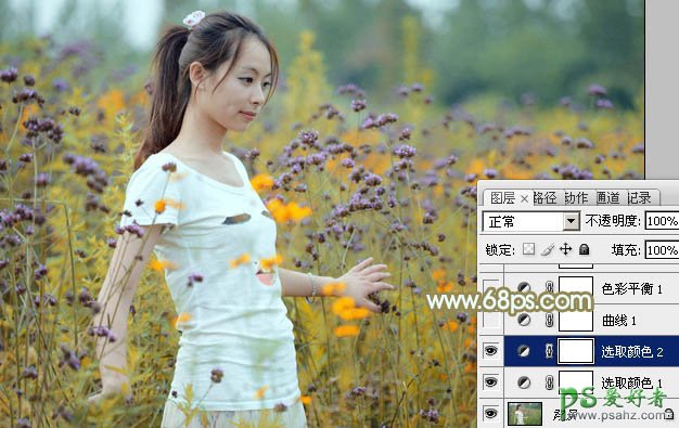 PS调色教程:给野花丛中的清新美女图片调出唯美的粉黄色