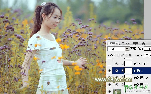 PS调色教程:给野花丛中的清新美女图片调出唯美的粉黄色