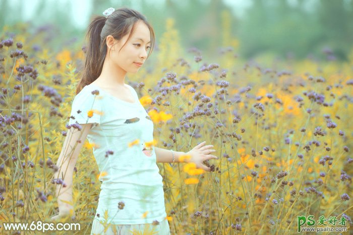 ,PS调色教程:给野花丛中的清新美女图片调出唯美的粉黄色,调色的时候可以把背景部分转为较淡的粉色,然后把人物肤色调淡调红润,这样效果就非常清爽,甜美。