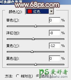 4、创建可选颜色调整图层,对红、黄、白、中性、黑进行调整,参数设置如图11 - 15,效果如图16。这一步把背景中的橙黄色调淡。
