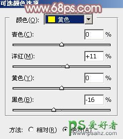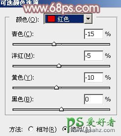 5、创建可选颜色调整图层,对红,黄进行调整,参数设置如图13,14,效果如图15。这一步给图片增加红褐色。