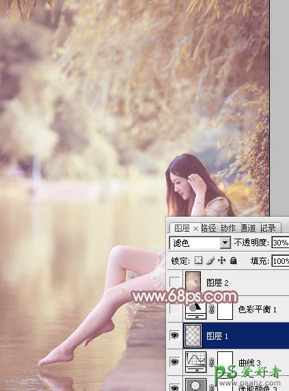 7、按Ctrl + Alt + 2 调出高光选区,按Ctrl + Shift + I 反选,新建一个图层填充红褐色:#84585A,混合模式改为“滤色”,不透明度改为:30%,效果如下图。这一步给图片暗部增加红褐色。