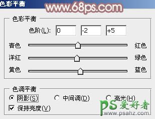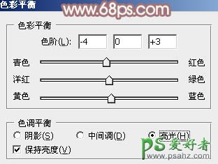 8、创建色彩平衡调整图层,对阴影,高光进行调整,参数设置如图21,22,确定后把不透明度改为:20%,效果如图23。这一步微调图片暗部及高光部分的颜色。