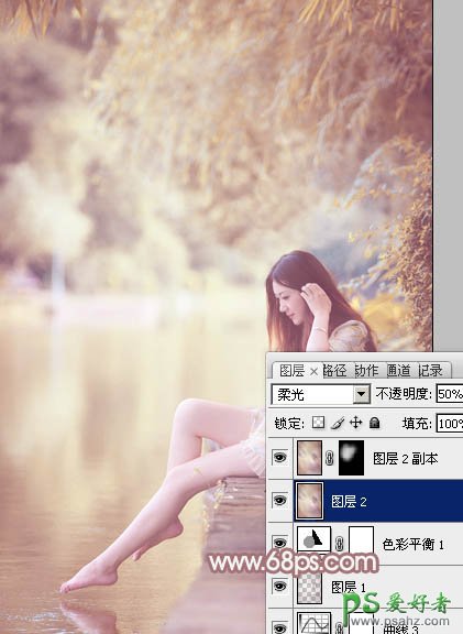 9、新建一个图层,按Ctrl + Alt + Shift + E 盖印图层。执行:滤镜 > 模糊 > 动感模糊,角度设置为-45度,距离设置为180,确定后把图层混合模式改为“柔光”,不透明度改为:50%,效果如下图。这一步把图片柔化处理。