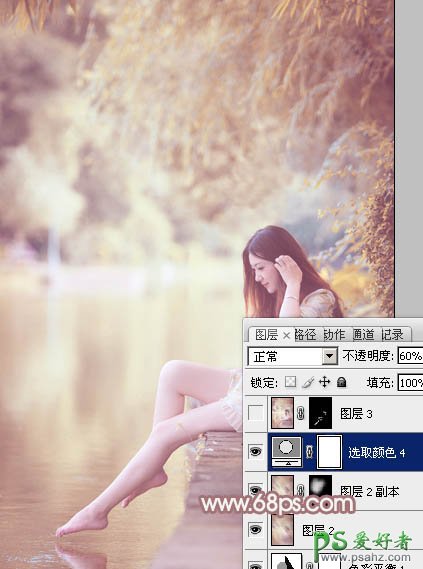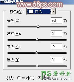 10、创建可选颜色调整图层,对红,白进行调整,参数设置如图25,26,确定后把图层不透明度改为:60%,效果如图27。这一步主要给图片高光部分增加淡蓝色。